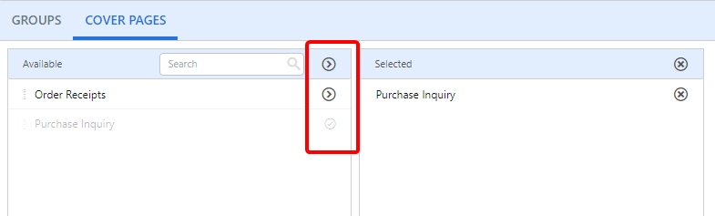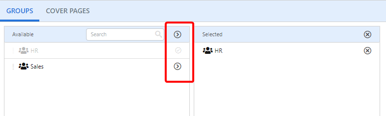 Click Add (>) next to the cover page(s) you want to add for the user. Or, move cover pages from the Available box to the Selected box using a drag-and-drop operation.