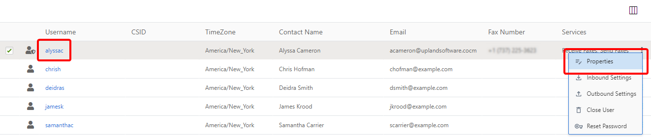 • Right-click anywhere in the user row or click the three dots next to the user you want to view properties for, then select Properties from the drop-down menu.
