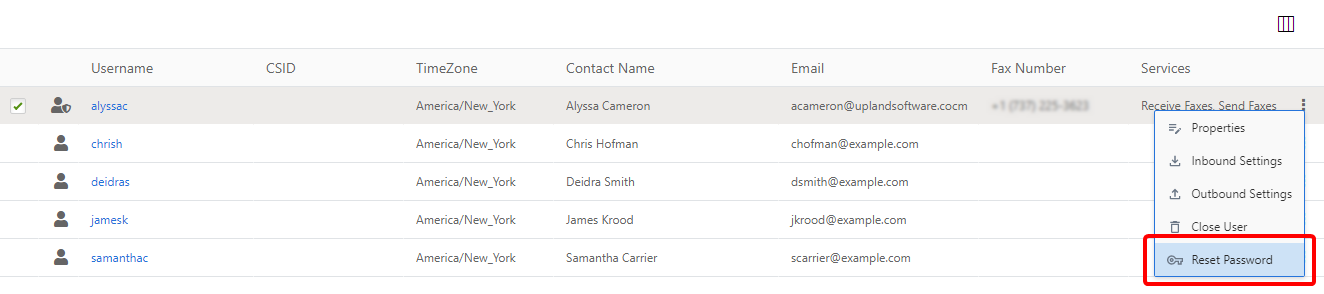 1. Right-click anywhere in the user row or click the three dots next to the user you want to force a password reset for, then select Reset Password from the drop-down menu.
