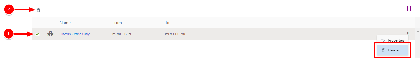Click the three dots next to the IP address range you want to delete, then select Delete from the drop-down menu. Or, select the check box next to one or multiple IP address ranges, then click Delete.