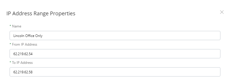 To allow access from a range of IP addresses, type the lower IP address in the From IP Address box and the higher IP address into the To IP Address box. For example: From IP Address – 62.219.62.54, To IP Address – 62.219.62.58.