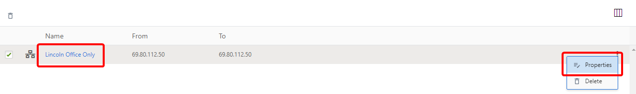 Click the three dots next to the IP address range you want to view properties for, then select Properties from the drop-down menu. Or, click the name of the IP address range you want to view properties for.