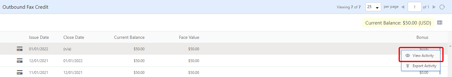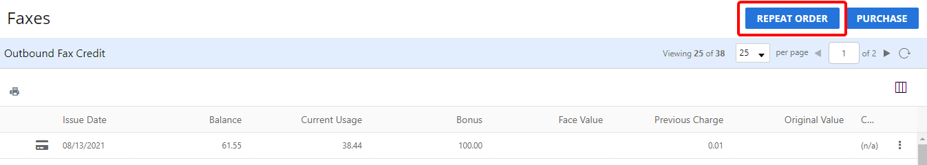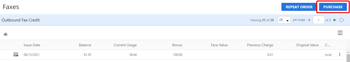 On the Outbound Fax Credit page, you can view a detailed list of the individual cards that have been applied to your account. For prepaid accounts, you can also purchase additional outbound fax credit and set up automatic repeat orders.