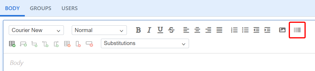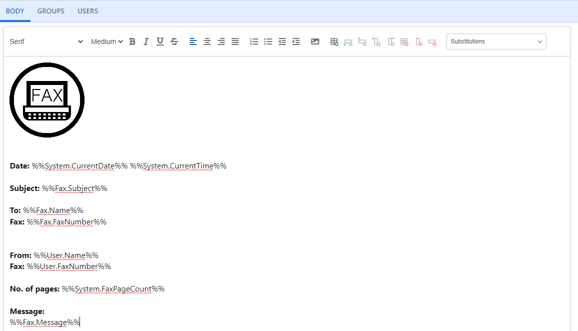 On the body tab, you can create your template. Use the formatting bar along the top to format the text. You can insert images, barcodes, tables, and substitution variables. Substitution variables can pull account information, system date/time, user information, or values from fields when the fax is sent.
