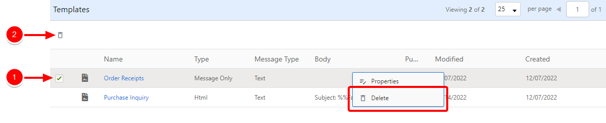 Right-click anywhere in the template row or click the three dots next to the template you want to delete, then select Delete from the drop-down menu.