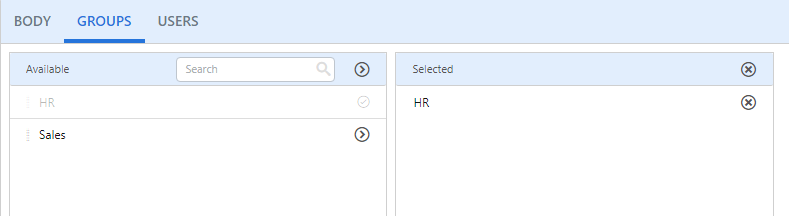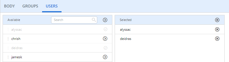 Click Add (>) next to the user(s) you want to make the template available to. Or, move users from the Available box to the Selected box using a drag-and-drop operation.