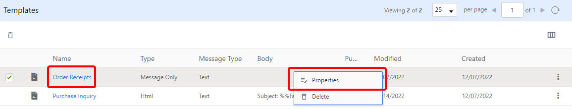 - Right-click anywhere in the template row or click the three dots next to the template you want to view properties for, then select Properties from the drop-down menu.