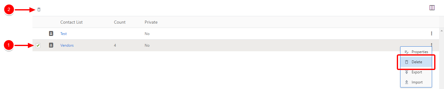 Right-click anywhere in the contact list row or click the three dots next to the contact list you want to delete, then select Delete from the drop-down menu.