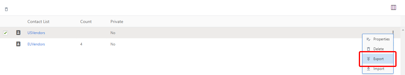 Right-click anywhere in the contact list row or click the three dots next to the contact list you want to export, then select Export from the drop-down menu.