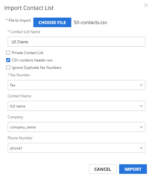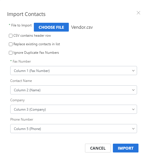 Map the Fax Number, Contact Name, Company, and Phone Number to applicable columns in the .csv file.