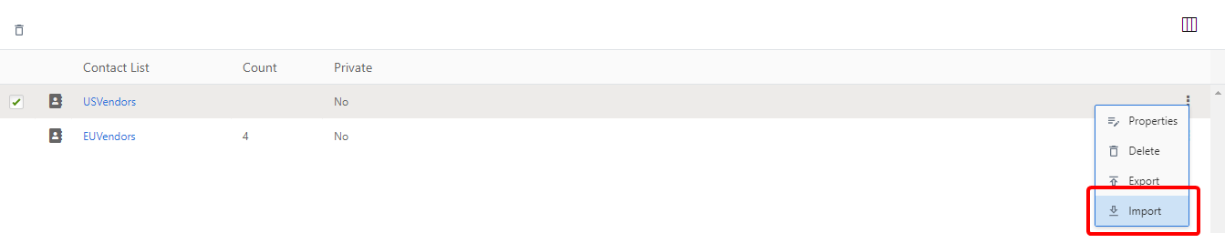 Right-click anywhere in the contact list row or click the three dots next to the contact list you want to import contacts into, then select Import from the drop-down menu.