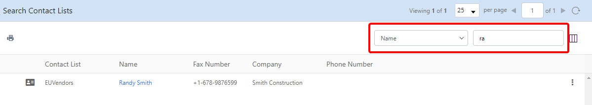 When you have a large set of contacts, you can search for a contact by Name, Fax Number, or Company. This will perform a search across all of your contact lists.