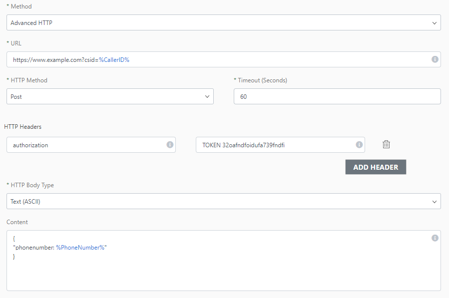 Text (ASCII): The content being transmitted in the HTTP body is encoded using the ASCII character encoding scheme. When this option is selected, enter HTTP body content in the Content field. This field supports data field substitution. Enter % to view a drop-down list of all the available fields.