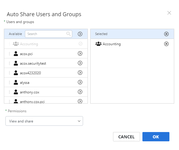 To remove a user or group from auto share, click Remove (X) next to the user or group in the Selected box.
