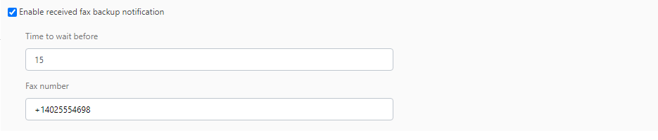 In the Time to wait before field, specify the number of minutes to wait after a notification has failed before sending to the specified fax number.