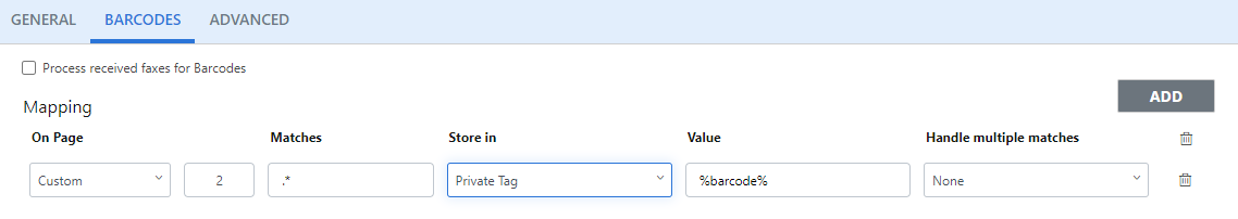 Barcode processing allows you to automatically extract barcode data from your received faxes and store the values into custom properties or private tags.