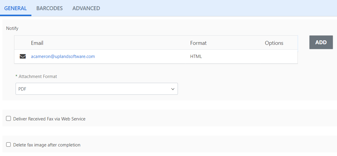Select the Process received faxes for Barcodes check box to enable barcode processing for inbound faxes.