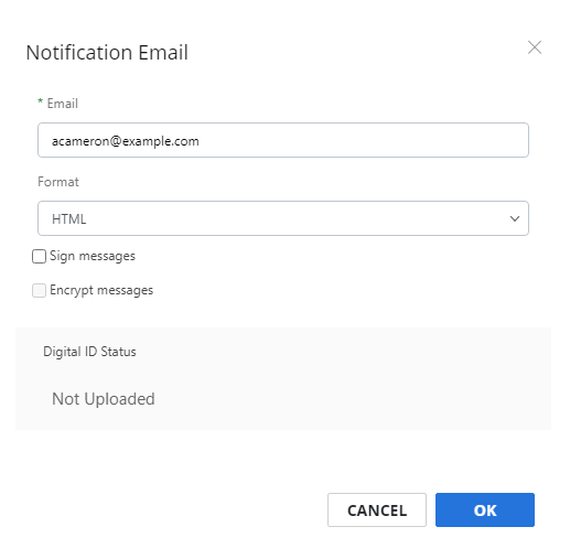 Select the Sign messages check box to have all emails sent to you with incoming faxes signed by InterFAX. This allows you to verify that the message was sent from the InterFAX service and not from a third-party posing as InterFAX. This setting is automatically selected when you send a signed message as described under Digital ID Status below.