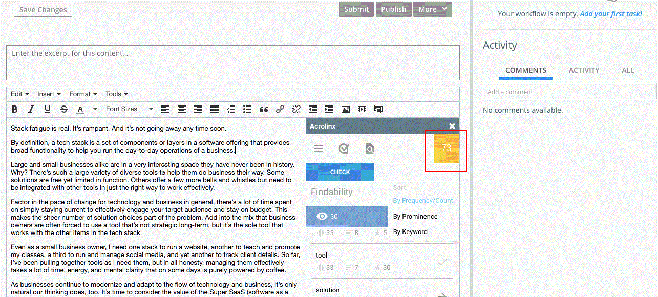 The number in the upper right-hand corner contains the score for content. The full scorecard and other information can be accessed within Acrolinx by selecting the side panel options.