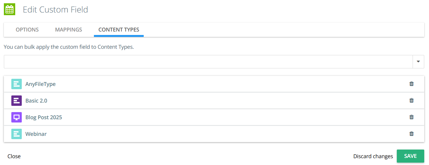 Custom fields can be applied to content types in bulk directly when creating or updating a custom field, eliminating the need to configure each content type individually. This feature introduces a new ''Content Types'' tab, where admins can select multiple content types from the drop-down.
