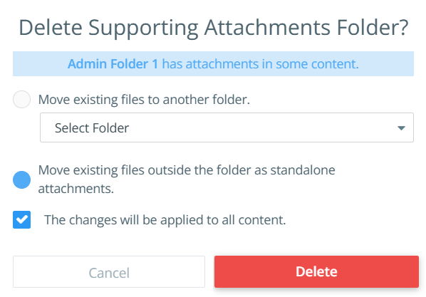 Select the The changes will be applied to all content checkbox. This means that once the folder is deleted and saved, it will be automatically removed from all existing content of this content type. Additionally, the attachments in the deleted folder will either be moved to the selected folder or converted into standalone attachments, based on your selection.