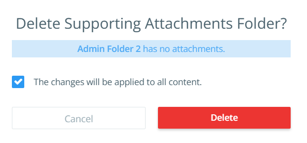 The 'Delete Folder' pop-up will notify that there are attachments in the folder within some content.