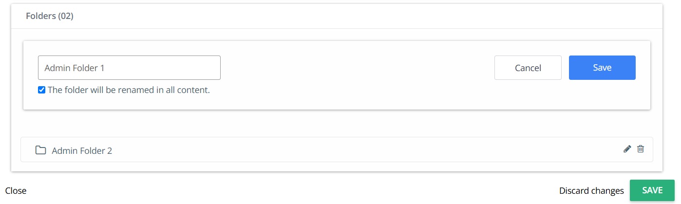 Admins can create folders here so that users have predefined folders available when they create content using this content type and upload attachments to these folders. A maximum of 10 folders can be created.