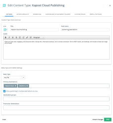 Kapost Admins configure the settings for the content types their teams use in their content operation. Content type settings can be edited at any time by Kapost Admins.