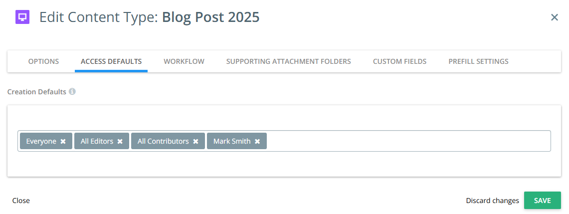 Configure the content type’s creation defaults here, that determine which users (individual, groups or everyone) in your Kapost instance are allowed to create this type of content.