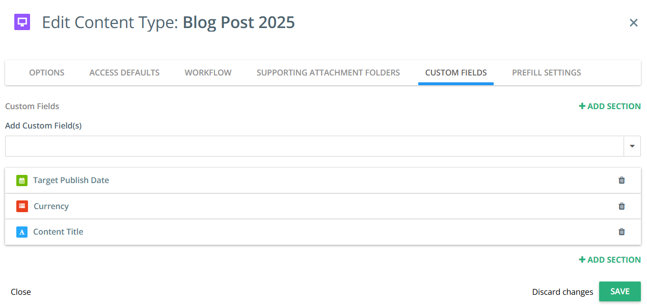 You can add custom fields and drag and drop them under the relevant section. Each section can be assigned to a specific team or group responsible for applying certain custom fields to specific content types.