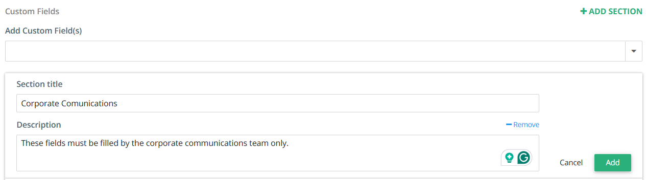 - To help eliminate confusion when it comes to tagging content, create sections to organize related custom fields that should be grouped together. For example, you can specify which teams or groups in Kapost should be responsible for applying specific custom fields on certain types of content.