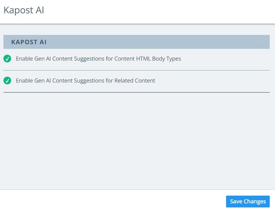 Admins can enable or disable the AI plug-ins from the Kapost AI settings page.