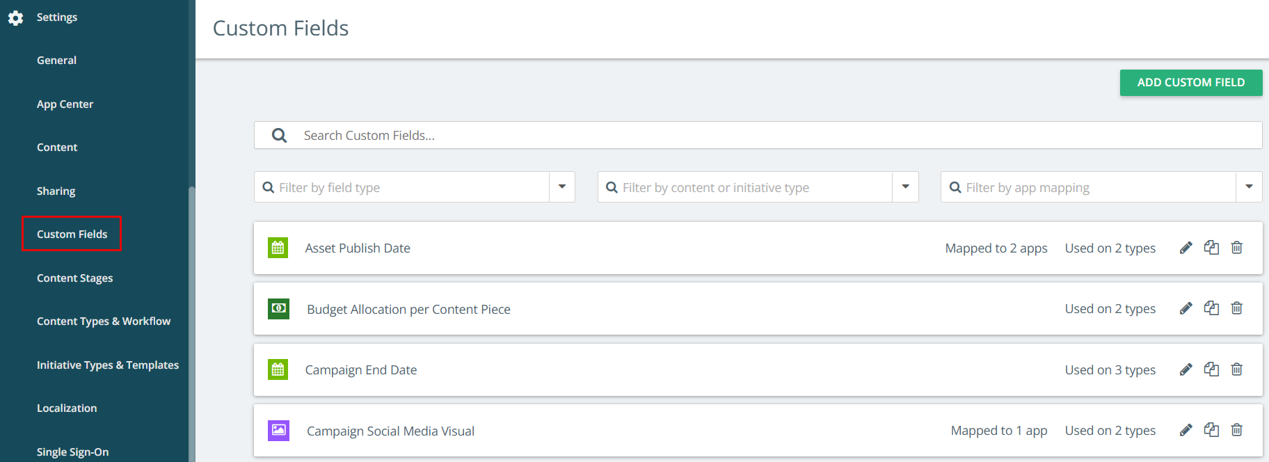 Kapost Admins can add, remove, map, edit and filter custom fields in the settings area. Navigate to your custom fields via the side navigation bar: