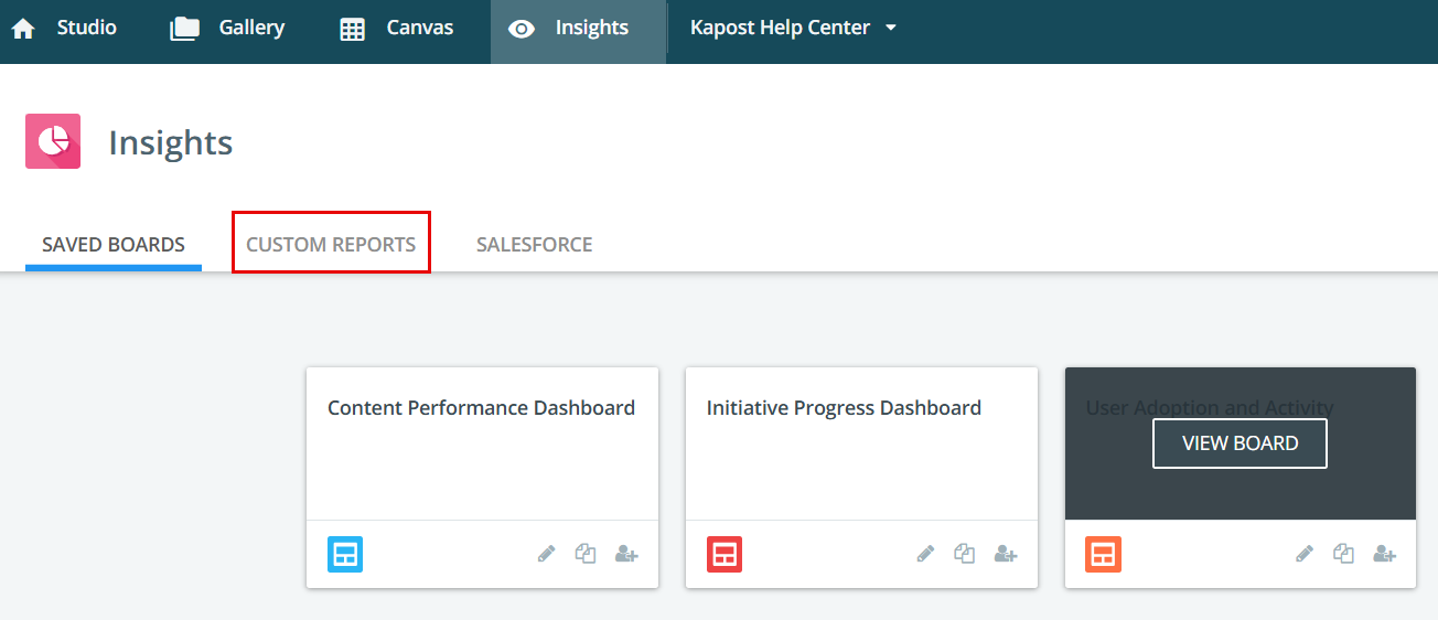 Navigate to the Insights app at the top of the screen. Select the Custom Reports tab.