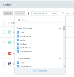 Add Columns by clicking the Columns drop-down from the content menu and selecting the appropriate checkboxes. Drag and drop to re-order. Once you have the correct filters and columns applied to your view you can Save the View to reference at a later time.