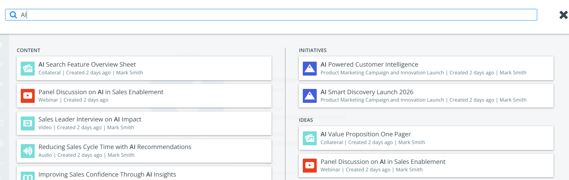 - Results are arranged into three categories by type: Content, Initiatives, and Ideas.