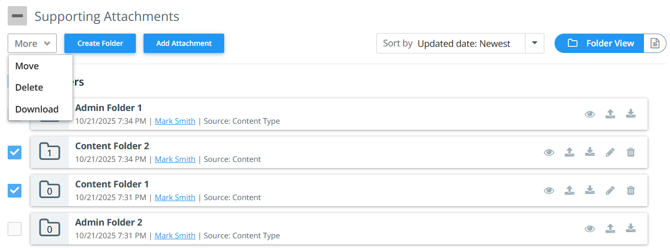 Users can move attachments, whether from a folder or standalone, using the More drop-down. Attachments can be moved to another folder or made standalone.