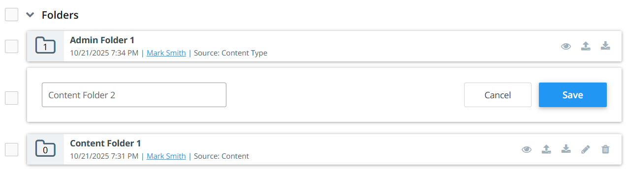 Note: The source of a folder is displayed as Content for folders created on the Content Details page, and as Content Type for folders created by admins in Content Types and Workflow Settings.