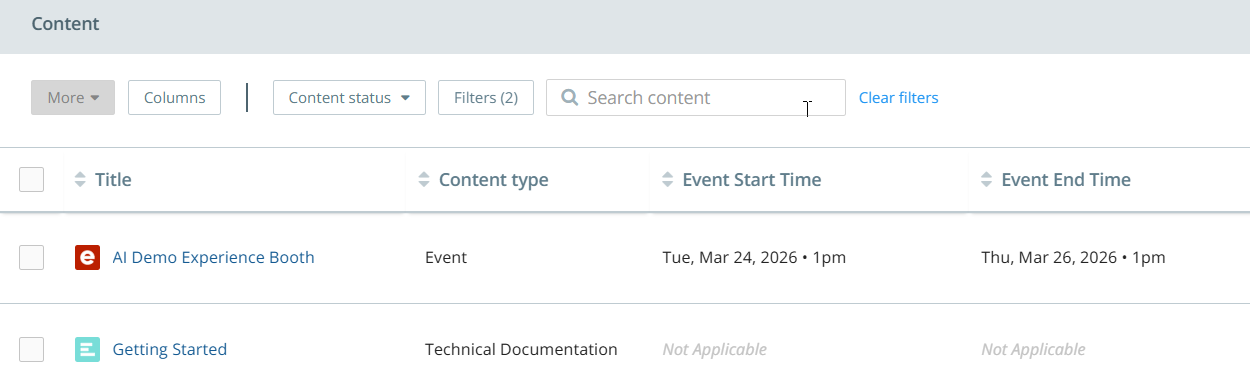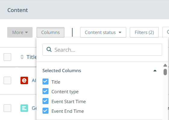 In the Content Catalog Columns dropdown, under the Content Details section, two new options, “Event Start Time” and “Event End Time,” have been added.
