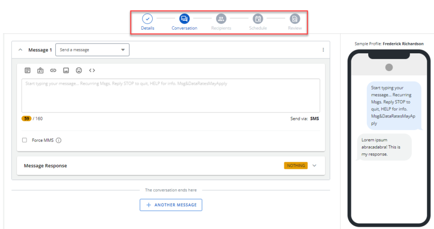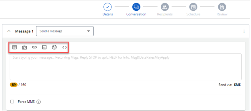 Improved Character Count Accuracy in Message Composer: Reinstated the earlier character count logic in the "Conversation" stepper of the Broadcast Journey to fix discrepancies when using insertable elements like links or dynamic tags. Now the character count will run on average message length during composition.
