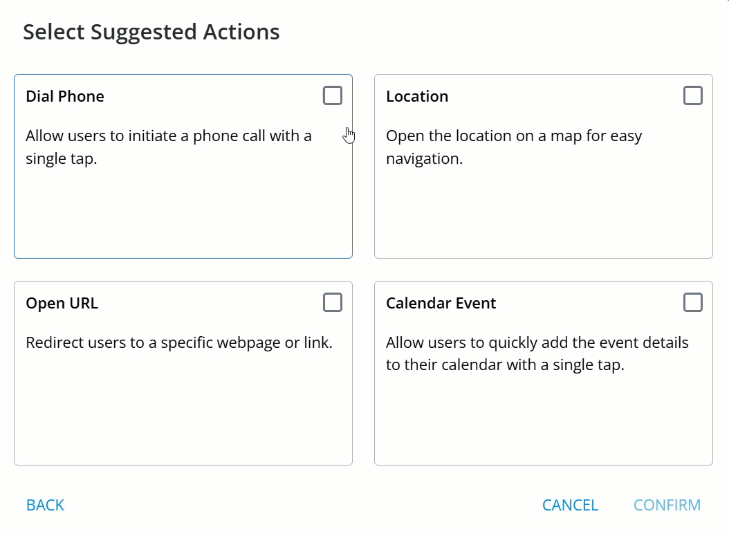 Once carrier support is in place, you’ll be able to add rich, interactive actions to your RCS messages, including: