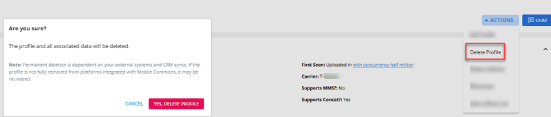 Note: Permanent deletion is dependent on your external systems and CRM syncs. If the profile is not fully removed from platforms integrated with Mobile Commons, it may be recreated. Deleting the profile deletes the profile and all its associated data. These deleted profiles appear as non-clickable links in the Inbox and Outbox pages with no actions menu.