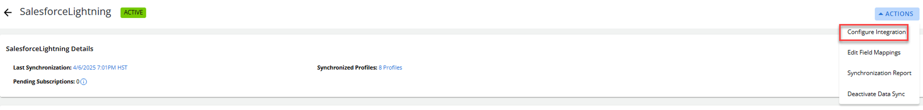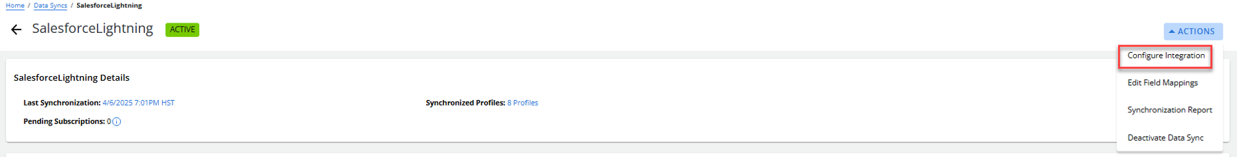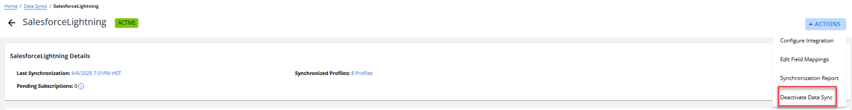 If you need to shut off the data sync with your Salesforce Lightning CRM system, whether temporarily or permanently, you can deactivate it. For more information, see Deactivating the integration.