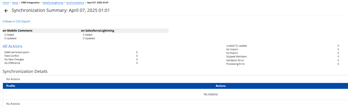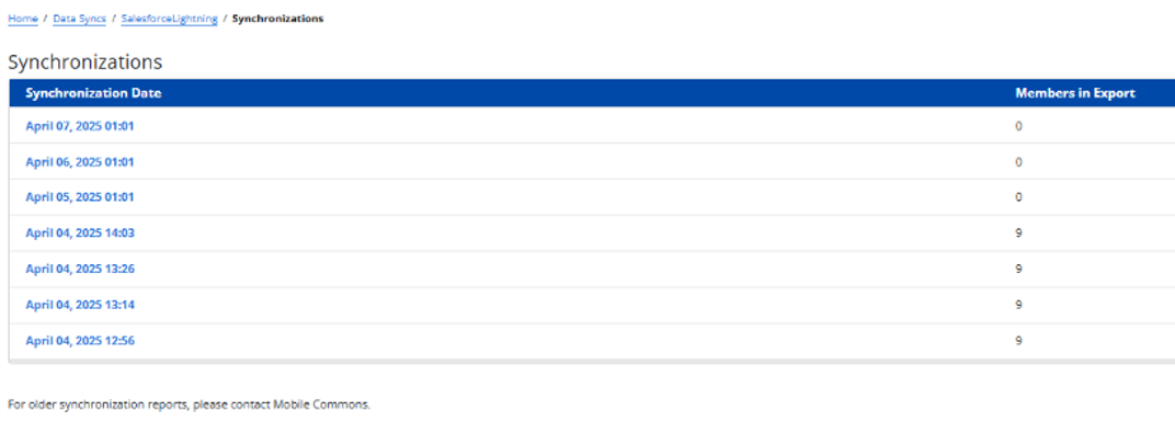 View a detailed synchronization report of each overnight sync, including the number of profiles synced and direct links to the corresponding profiles in Mobile Commons. After activation, the Mobile Commons data set and your Salesforce Lightning database are both updated on a regular basis: