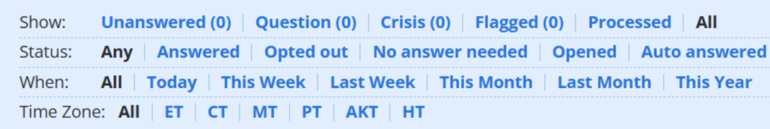 Subfilter Description Unanswered Messages that have been received but not yet answered. Processed Messages that have been answered or marked No response or No response needed. All All of the message records in your company account regardless of opt-in status. -
