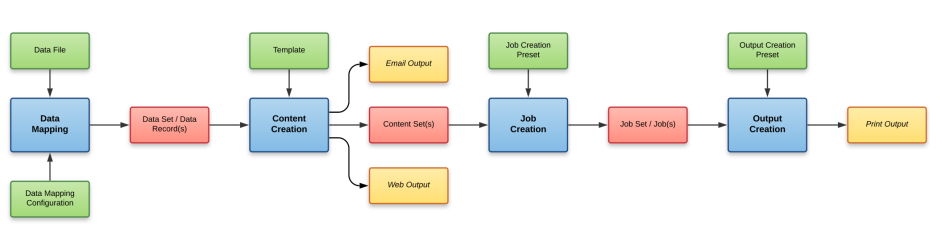 Typically an individual workflow process (shown above in blue) will take one or more input files as input (shown above in green), and will produce either intermediary output in the form of a data entity (shown above in red), or final output in the form of print, web, or email based content (depending on the context of the content produced) (shown above in yellow).