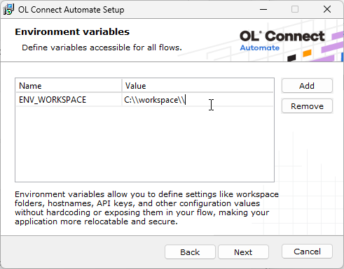 The recommended method for defining environment variables is set them during installation using the OL Connect Automate Installer. Click Add in the Environment variables window, then enter the Name and Value for the environment variable.