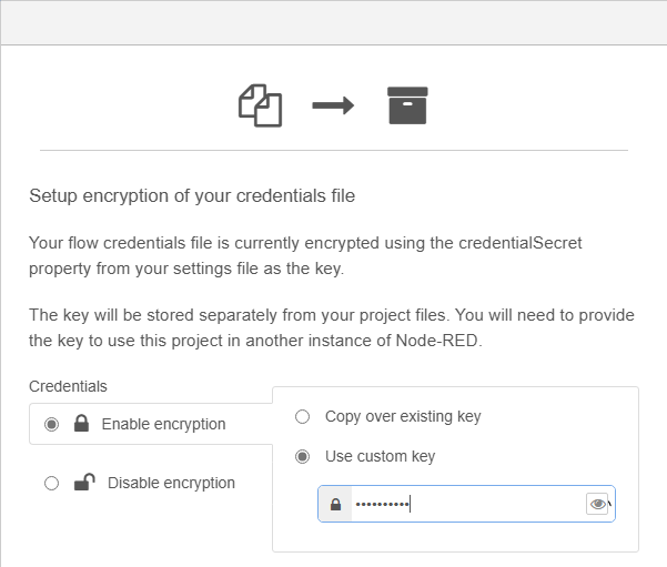 OL Connect Automate stores your flow credentials outside of the project folder, in an encrypted credentials file. If you move or share your encrypted project, for example, to another instance of Node-RED or OL Connect Automate, you’ll need the key to decrypt and access the credentials.