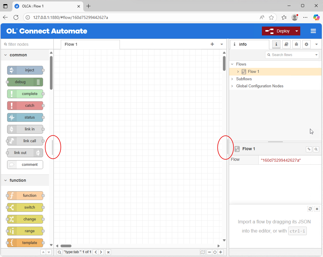 Once OL Connect Automate is installed, you should explore the workspace. If you are already familiar with Node-RED, the workspace is similar, but has enhancements.