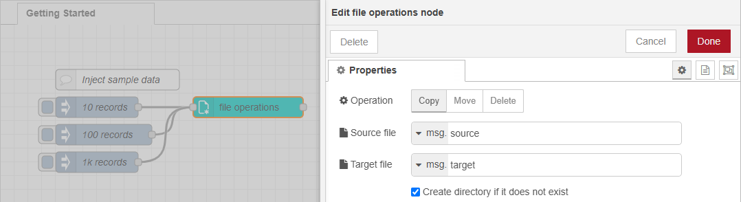 Next, configure the file operations node to copy the file from the path in msg.source to the path specified in msg.target.